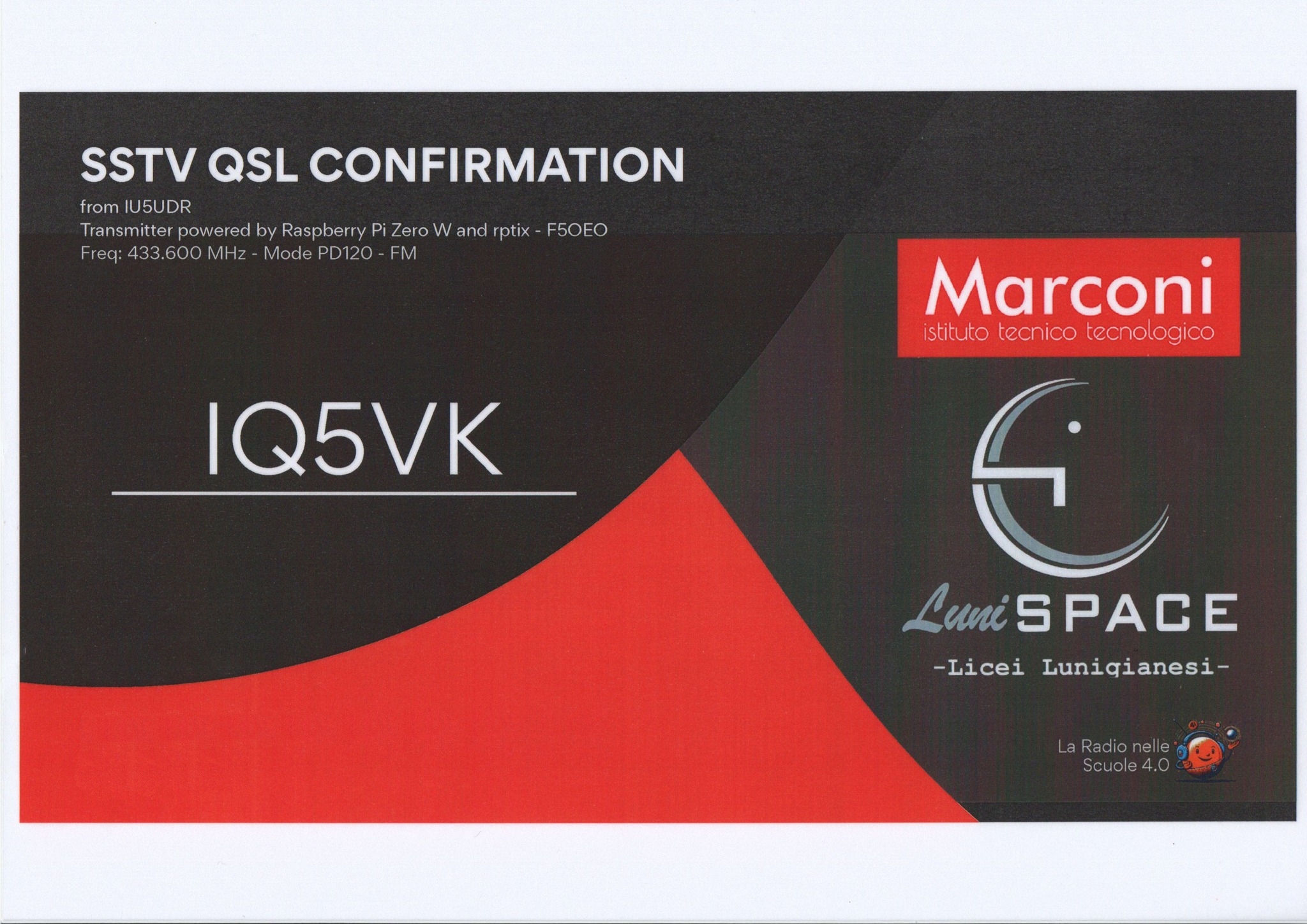 Ringraziamo LuniSpace per la QSL relativa al lancio della radiosonda da Fivizzano per la ricezione delle immagini in SSTV inviate dalla sonda.